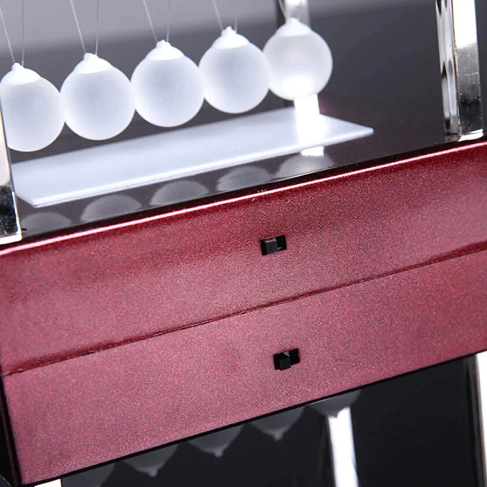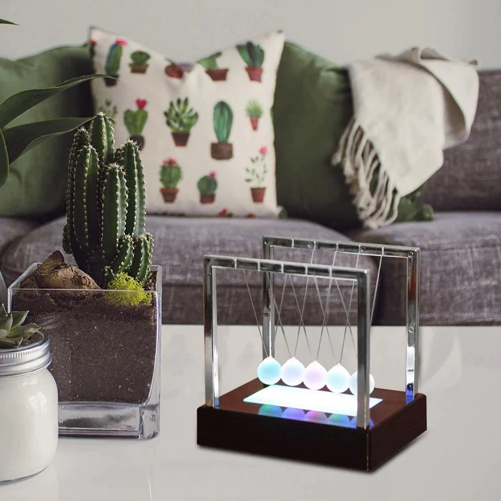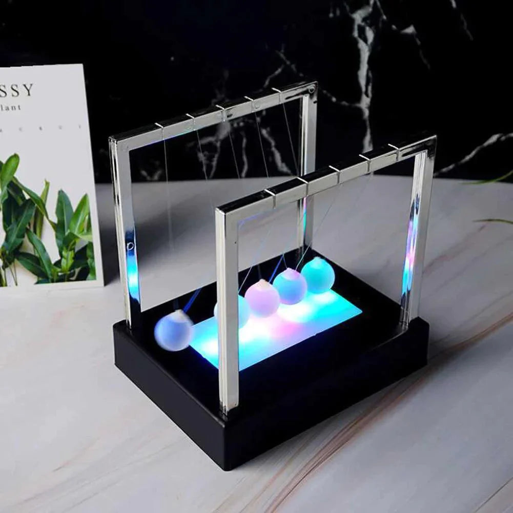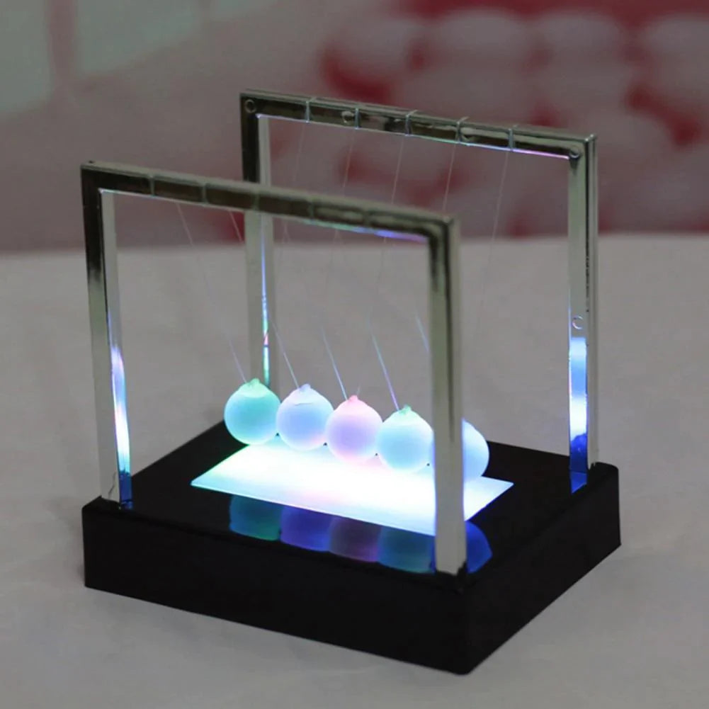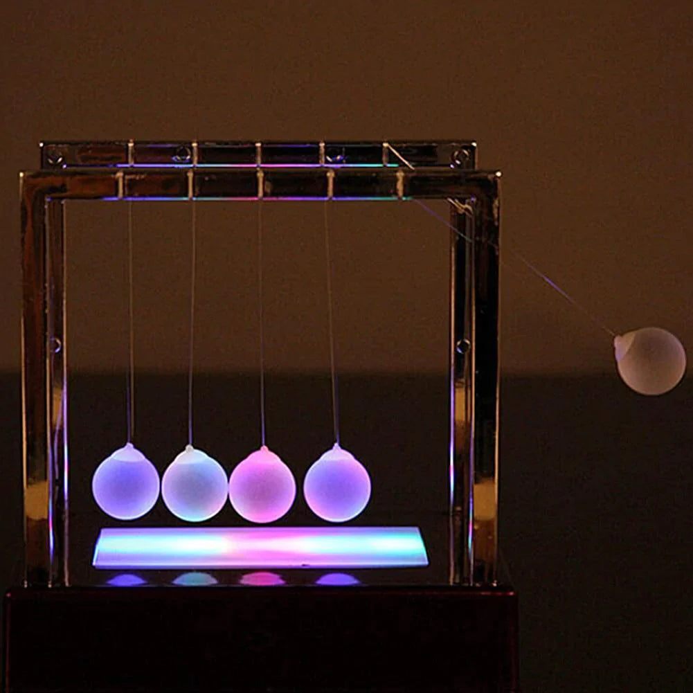 The motion of this 5-ball cradle is the most addicting way to demonstrate Newton's law of conservation of momentum and energy, which makes it a great teaching tool, in addition to being fun to watch. And we've equipped each frosted glass sphere with LED, it's even more amazing. Lights react based on their position. Start a kinetic chain reaction with one ball and see how the others change color in response. One from each end set the LED to a single color and watch the light fade as they swing back and forth.