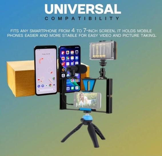 Our Phone All-in-one Filming Kit bracket fits any smartphone from a 4 to 7-inch screen. It holds mobile phones easier and more stable for easy video and picture taking.