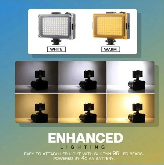 Easy to attach LED lights with built-in 96 LED beads. Powered by 4x AA battery. It's lightweight, portable, and compatible with smartphones and DSLR cameras. Enhance background lightning and take great-looking videos and photos.
