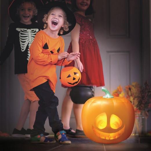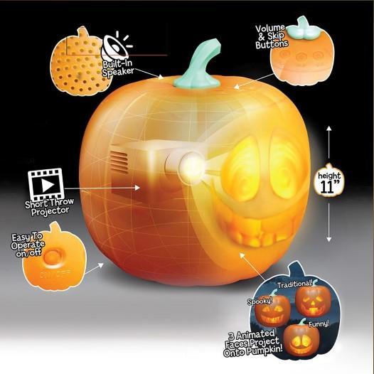 This is the animated jack o' lantern that entertains guests and trick-or-treaters with songs, jokes, and seasonal phrases.