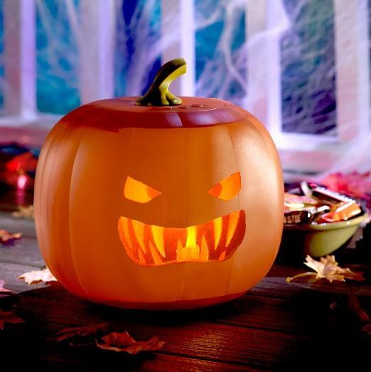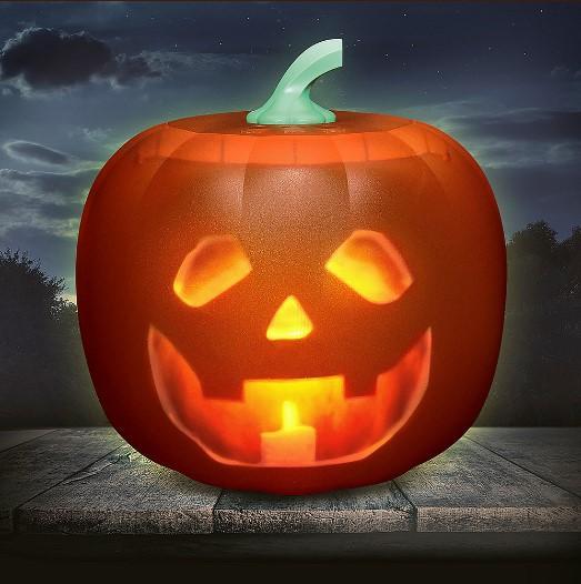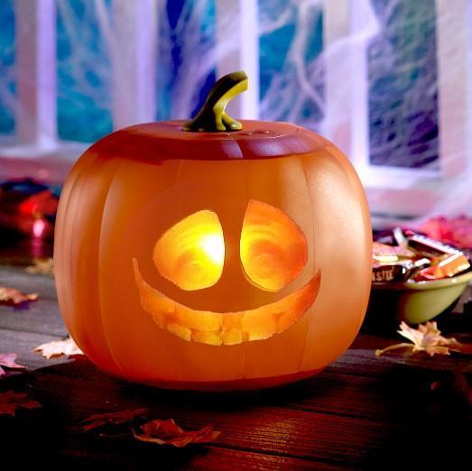 This is the animated jack o' lantern that entertains guests and trick-or-treaters with songs, jokes, and seasonal phrases. It has three different character themes—spooky, traditional, and funny—each with three songs and over 40 rib-ticklers and expressions. A built-in projector displays the animated faces on the pumpkin’s front while an integrated speaker of pre-programmed audio supplies the entertainment. With the volume and skip buttons. Can be set up on a tabletop, fireplace mantel, or outside under a covered porch. AC adapter with 27"-long cord. 7" H x 9" Diameter. (2 lbs.)