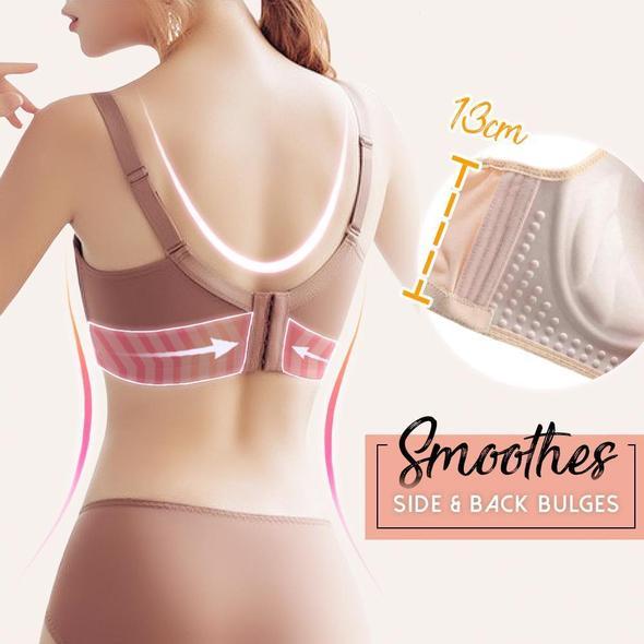 Together with cushioned shoulder straps, extra-wide side wings, and back panel in soft and stretchy fabric, it flattens side and back bulges while being so comfortable to wear.